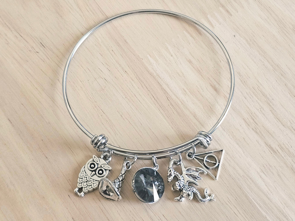 Each bracelet has 4 charms and 1 crystal in the middle. The 4 charms include an owl, witch hat, dragon, and deathly hollows symbol. The crystal's color is Smoke. You can choose any color in the drop down menu.