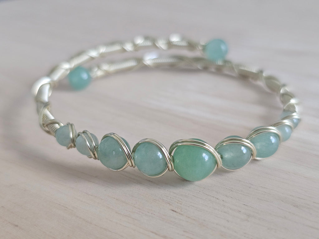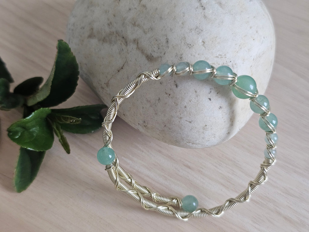 This handcrafted bracelet features smooth, natural green aventurine beads carefully wrapped in sleek light gold-tone wire. Each bead is individually secured, creating a fluid, slightly organic look that highlights the soft variations in color and texture of the stone. The cool, calming green tones make this bracelet easy to wear on its own or stacked with other favorites.