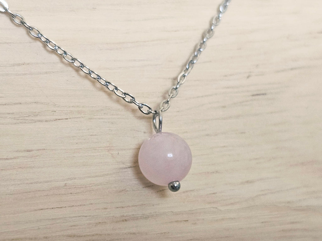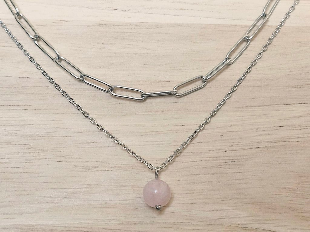 Elevate your everyday look with this effortless 2-layer silver colored steel necklace set featuring a modern paperclip chain and a dainty genuine Rose Quartz bead pendant.