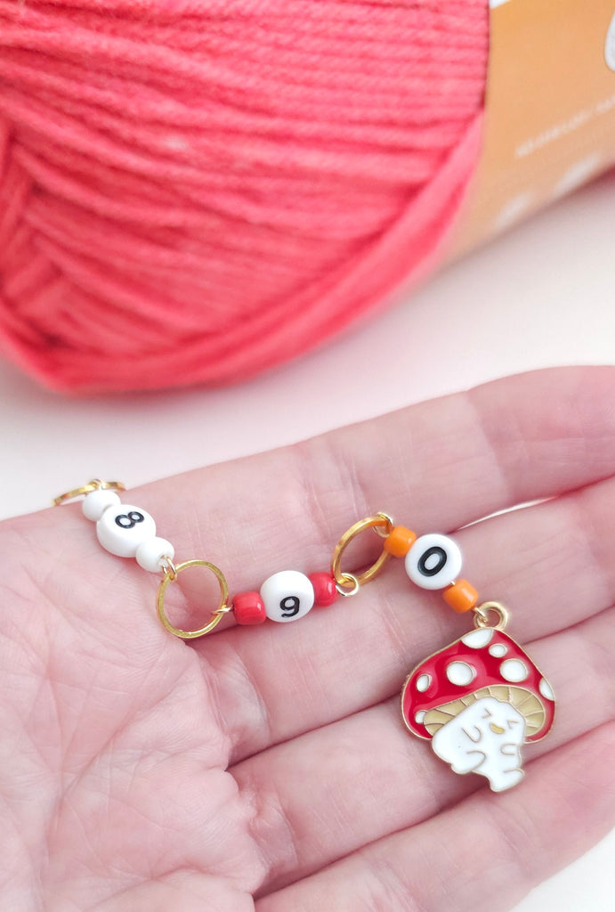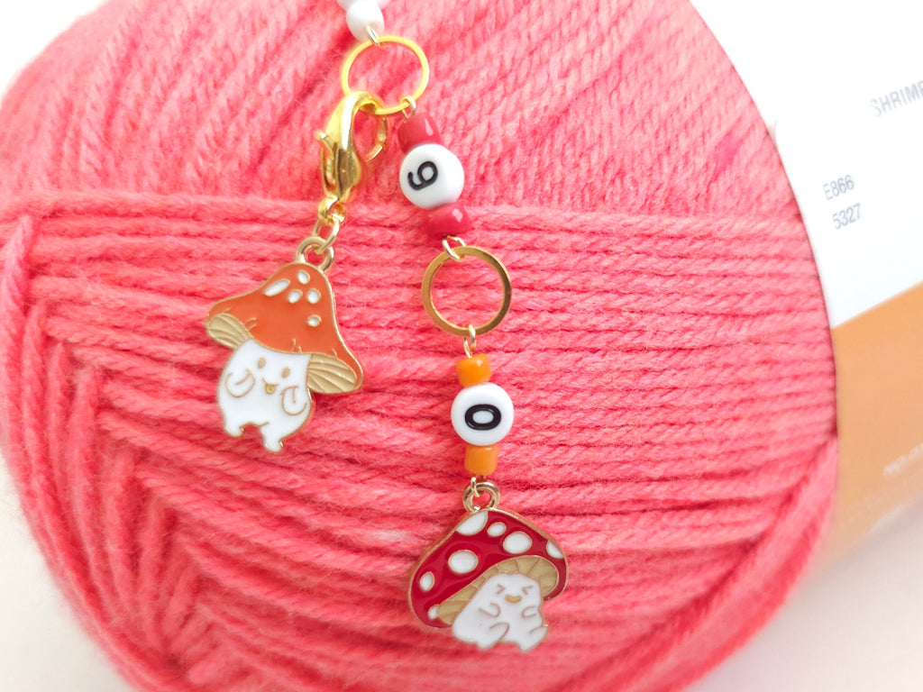 Lobster Clasp Stitch Marker with a cute mushroom character to keep track of rows in the 10s, 20s, 30s, etc.