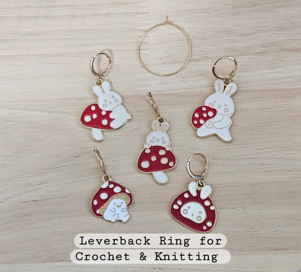 The adorable bunny rabbit and mushroom stitch markers are made with 5 resin charms and have a gold plated back. The attachment is your choice of Lobster Clasp, Solid Ring, Leverback Rings, or Bulb Safety Pins.