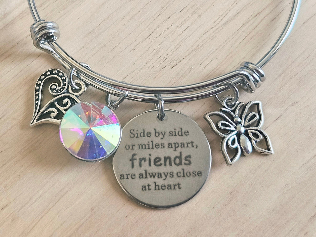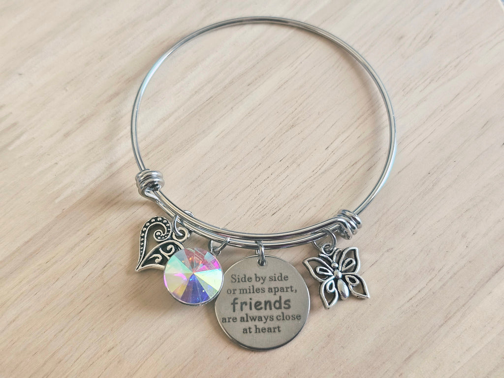 Each bracelet has 3 charms and 1 crystal in the middle. The 3 charms include a heart, circle charm that reads "Side by side or miles Apart, friends are always close at heart", and a butterfly. The crystal's color is Crystal AB. You can choose any color in the drop down menu.